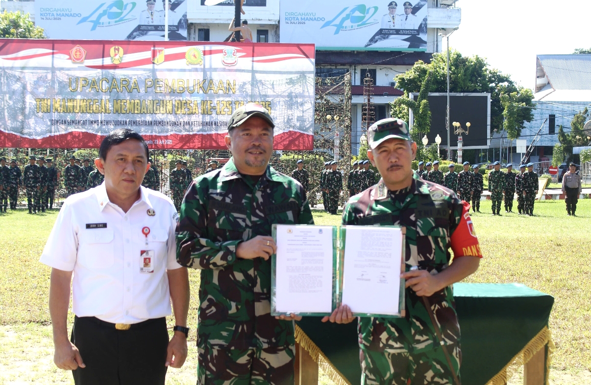 EKSPOSTIMES.COM- Program TNI Manunggal Membangun Desa (TMMD) ke-125 tahun 2025 resmi dimulai di Kota Manado. Kegiatan yang digelar oleh Kodim 1309/Manado itu dibuka langsung oleh Wakil Wali Kota Manado, dr. Richard Sualang, Rabu (23/7/2025), di Lapangan Sparta Tikala, dengan penyerahan simbolis alat kerja kepada tim TMMD.